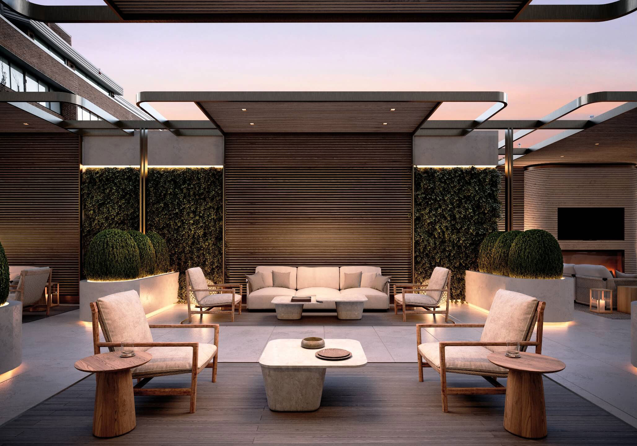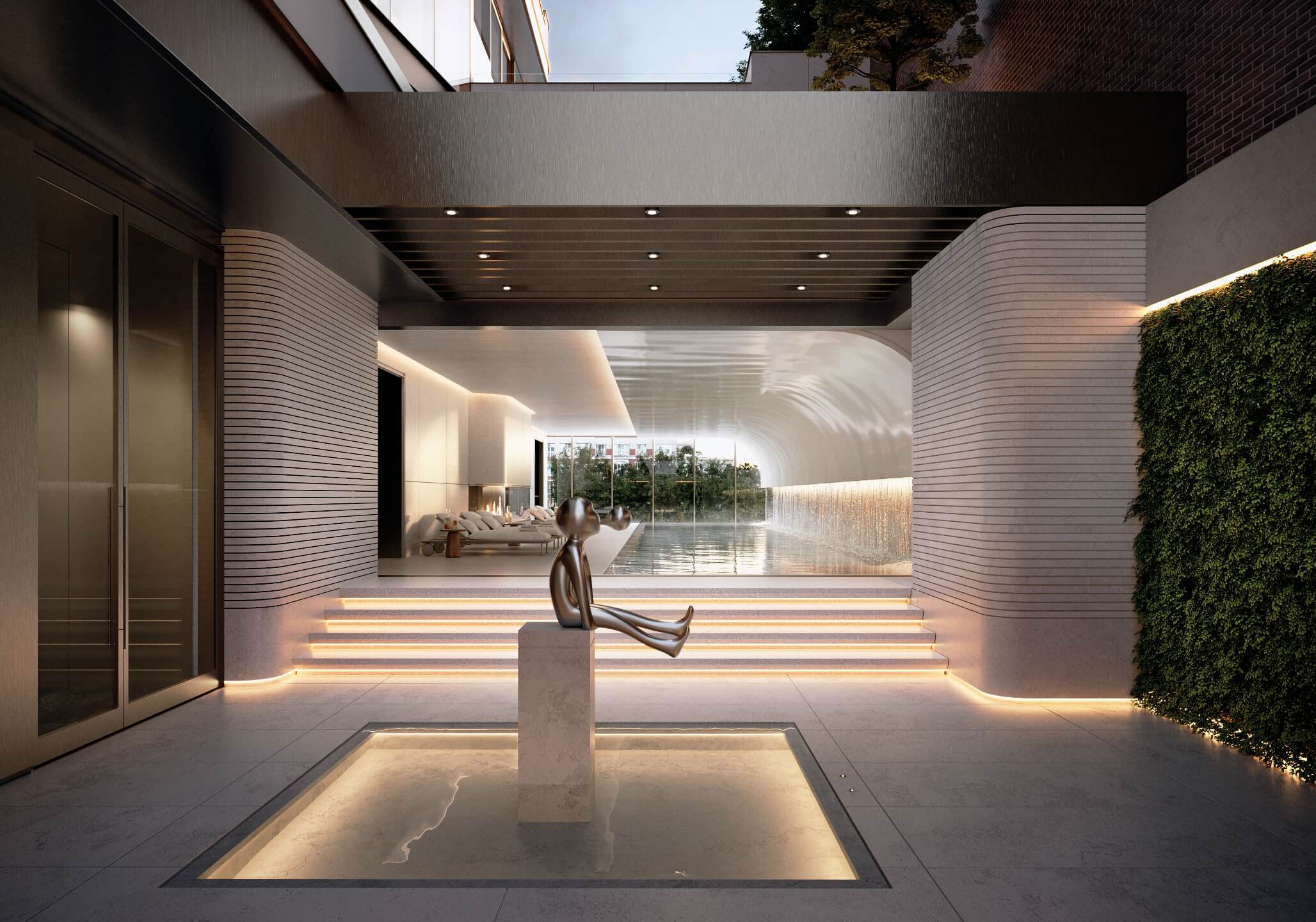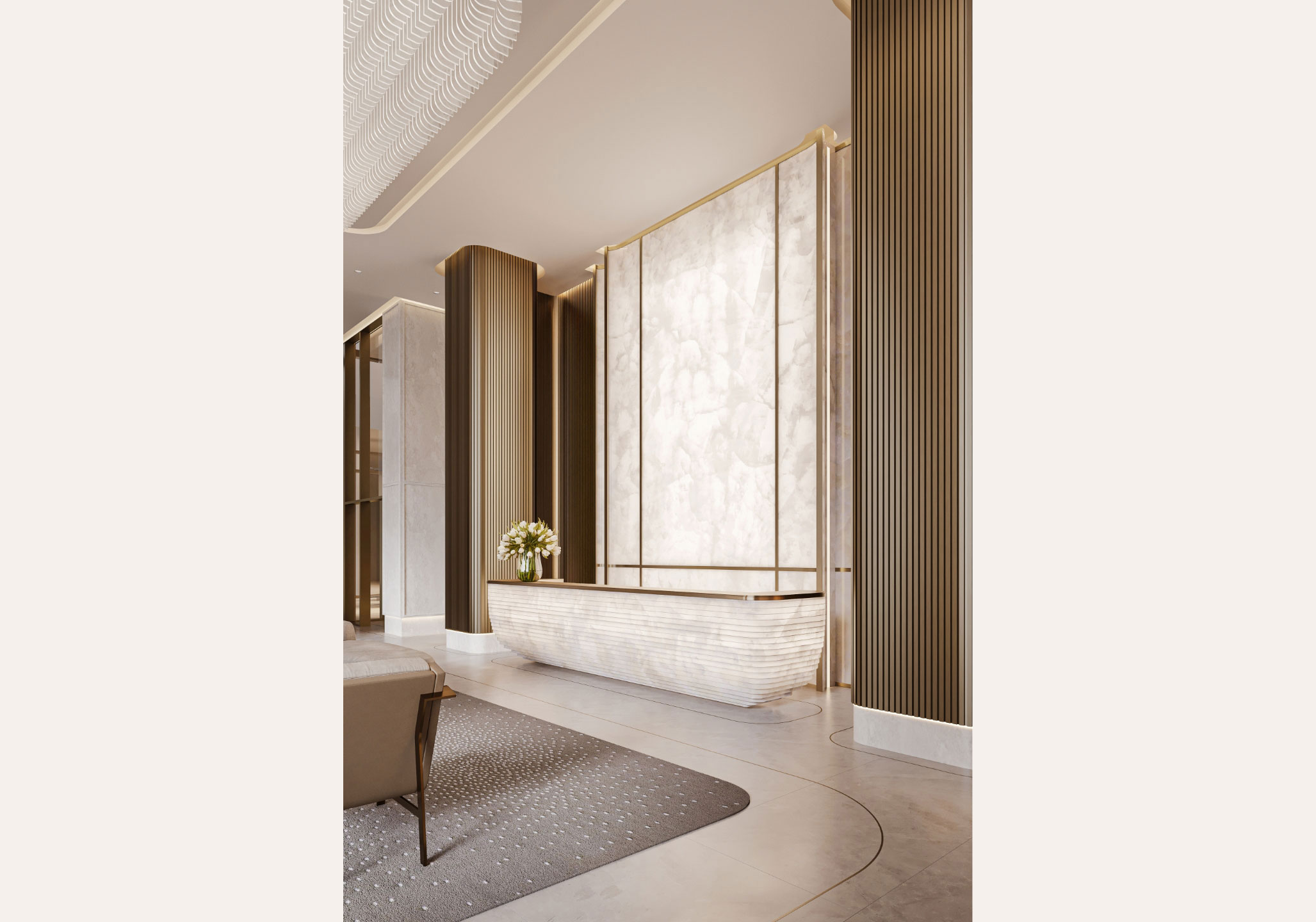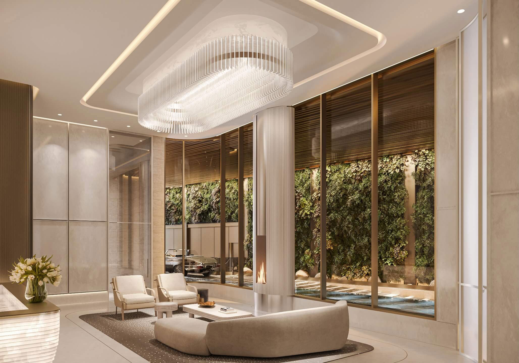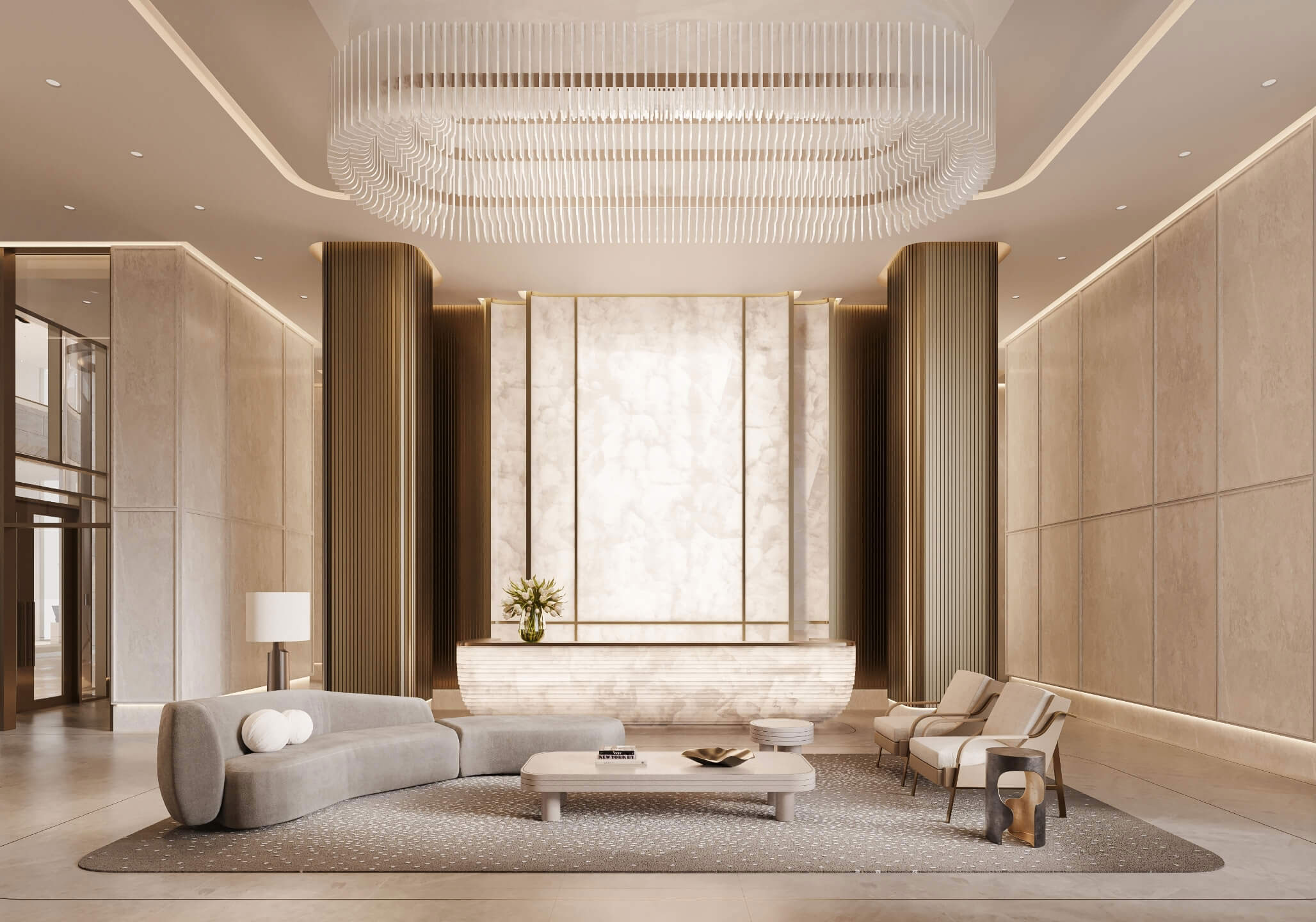 In a signature architectural movement, the lobby greets residents and their guests with floors and walls clad in timeless Vaniglia Bianco. For people driving in or out of the property, the lower-level valet reception is a perfect first and last impression echoing the lobby's charisma through recurring design details and materiality while offering a thoughtful hospitality moment with an espresso station.
