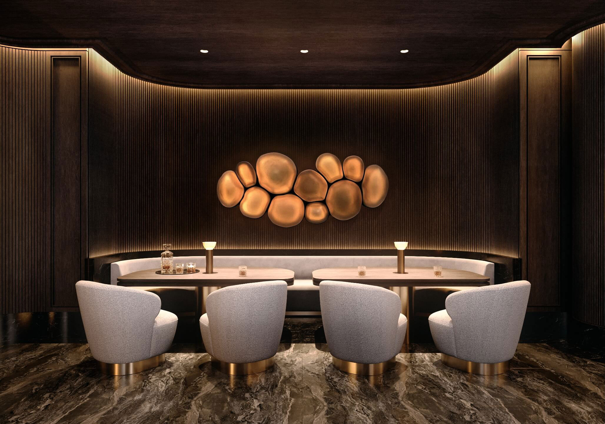 Inspired by some of the grand hotels and lounges Alessandro Munge designed around the world, 138 Yorkville’s cocktail bar is an expression of mystery. Dimly lit surroundings and carefully curated details create an intimate and enchanting atmosphere. The sultry glow of ambient lighting casts intriguing shadows, revealing glimpses of a space designed for those who appreciate the finer things in life.