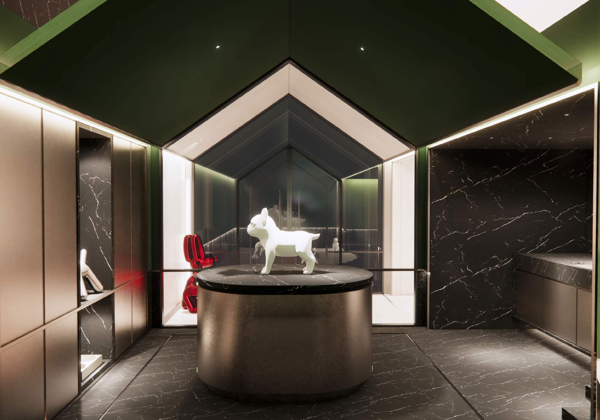 The epitome of pampering and relaxation for your beloved pets. This opulent sanctuary designed exclusively for their well-being and grooming houses a marble grooming table, private cleaning station, and open space to play and run freely.