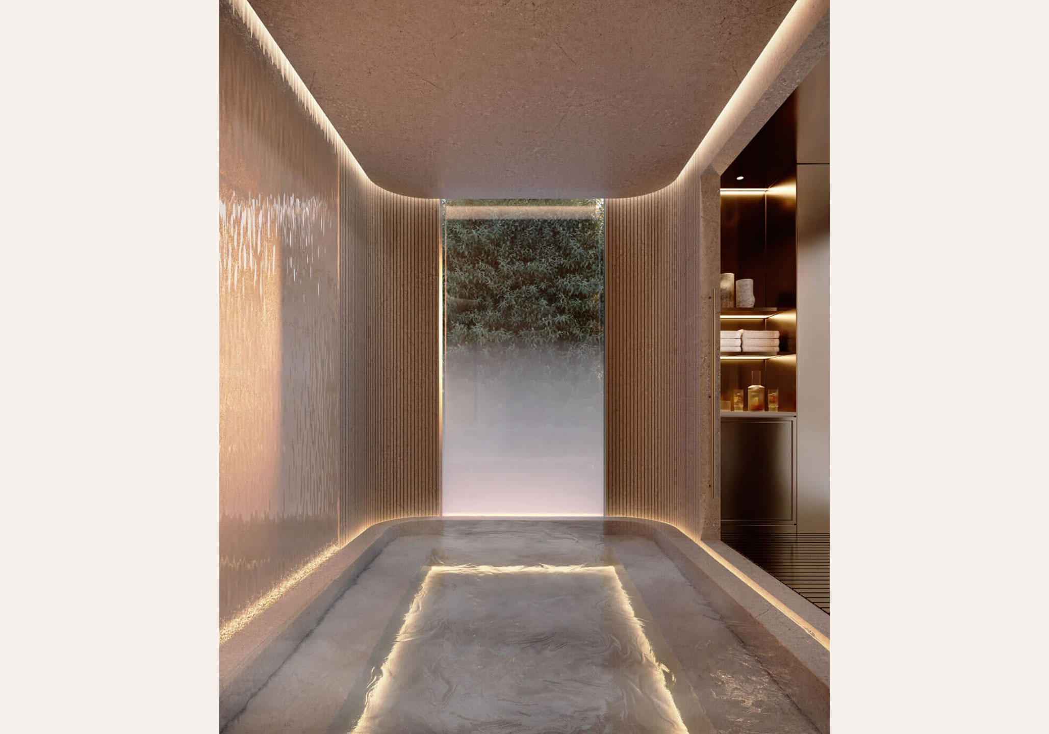 Experience ultimate relaxation with complete hydrotherapy featuring soothing thermae, invigorating cold plunge, and rejuvenating rain room experiences. Indulge in restorative red-light therapy or unwind in our infrared sauna before taking a plunge in the tranquil pool that boasts a serene waterfall and an expansive fireplace, providing a peaceful retreat to relax, recharge, and rejuvenate.
